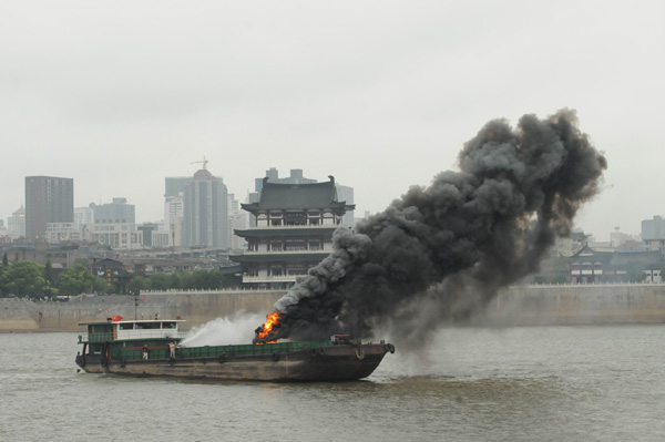 圖四 圖片說(shuō)明 一、上午9時(shí),一艘300噸的普通貨船從長(cháng)沙鑫宇公司碼頭出發(fā)下行航行至湘江杜甫江閣下游花炮平臺水域時(shí)候,與一搜客渡船發(fā)生碰撞,客渡船2名乘客受傷,10人落水,船體進(jìn)水失控,面臨沉沒(méi)危險。 二、這搜普通貨船在避讓落水人員時(shí),又與經(jīng)過(guò)的另外一艘油船發(fā)生碰撞,致該船油艙破損,油船在自救過(guò)程中發(fā)生火災、爆炸,并出現柴油泄漏。 三、湖南省水上搜救中心接到報警后,組織水上搜救隊緊急行動(dòng),各部門(mén)全力配合。落水乘客最先全部獲救,傷者也被送往醫院。之后遇險船舶被拖往安全水域。 四、大約50分鐘后,油船大火被撲滅,溢油得到控制,油污被有效清除。 |