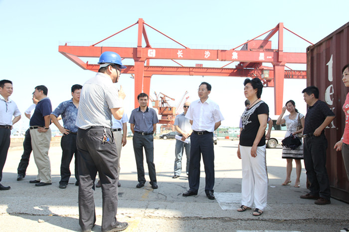 圖為長(cháng)沙集星集裝箱碼頭有限公司總經(jīng)理助理周勇(前左一)在向長(cháng)沙市政協(xié)黨組副書(shū)記、副主席鐘新蓮(前右一)、長(cháng)沙市開(kāi)福區區委書(shū)記李蔚(前右二)介紹長(cháng)沙新港目前的集裝箱業(yè)務(wù)情況。 2013年7月11日上午,長(cháng)沙市政協(xié)黨組副書(shū)記、副主席鐘新蓮在長(cháng)沙市開(kāi)福區區委書(shū)記李蔚的陪同下,就現代物流業(yè)發(fā)展情況來(lái)長(cháng)沙新港視察調研。湖南長(cháng)沙新港有限責任公司董事、財務(wù)總監趙赤書(shū),長(cháng)沙集星集裝箱碼頭有限公司總經(jīng)理助理周勇出席接待。鐘新蓮副主席對港口建設及港口目前的發(fā)展情況等一系列問(wèn)題進(jìn)行了深入考察。 |