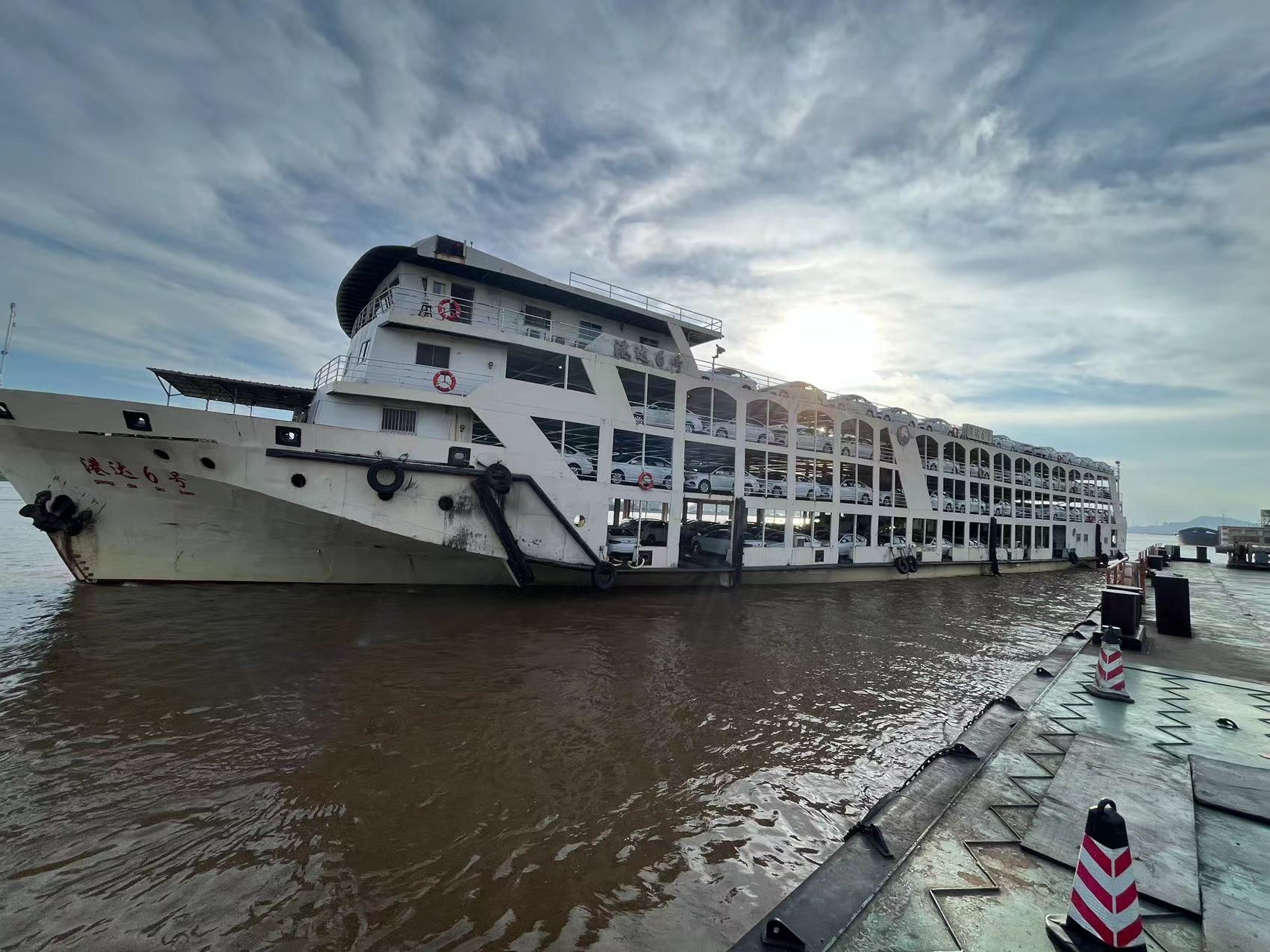 在歷經(jīng)十小時(shí)作業(yè)后,該批次車(chē)輛全部順利集港裝船。殘霞潛江波光爍,船鳴三聲水天開(kāi)。18時(shí),“港達6號” 滾裝船滿(mǎn)載357臺上汽大眾汽車(chē),沐浴晚霞余暉,順利駛出長(cháng)沙新港碼頭。