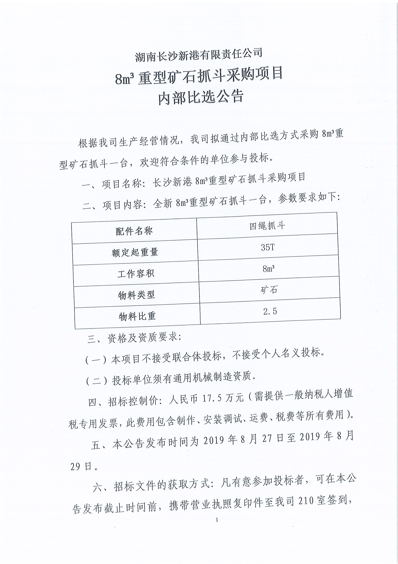 湖南長(cháng)沙新港有限責任公司8m³重型礦石抓斗采購項目?jì)炔勘冗x公告
