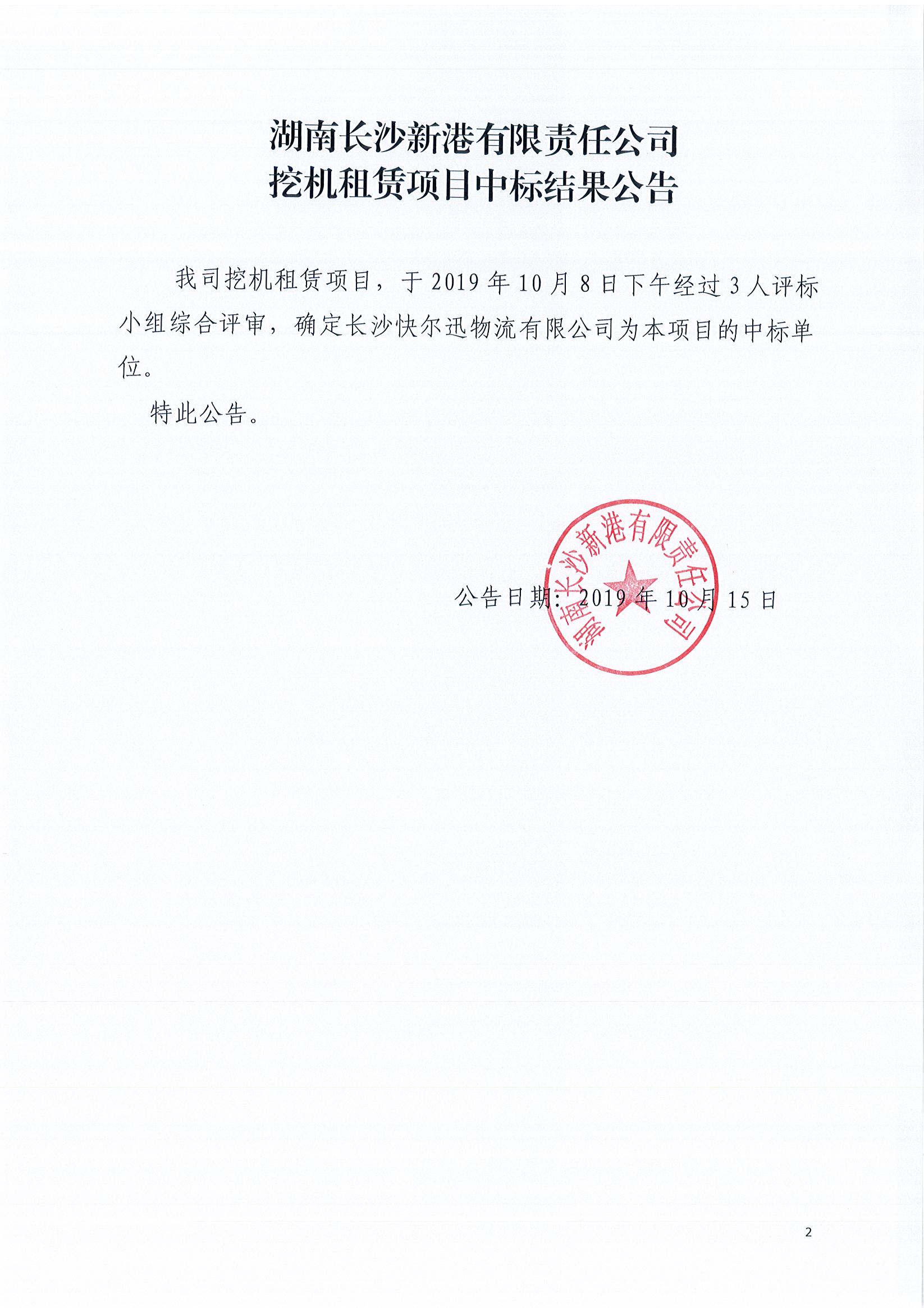 湖南長(cháng)沙新港有限責任公司挖機租賃項目中標結果公告