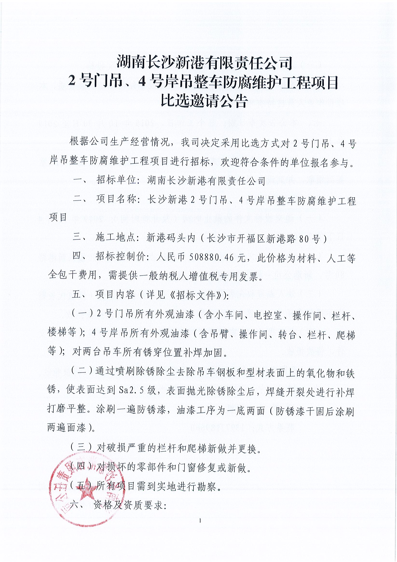 湖南長(cháng)沙新港有限責任公司2號門(mén)吊、4號岸吊整車(chē)防腐維護工程項目比選邀請公示