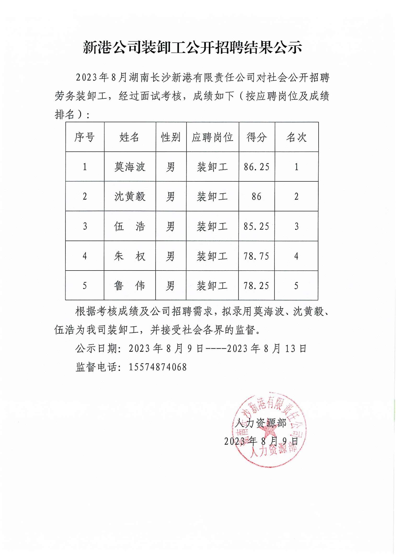 新港公司裝卸工公開(kāi)招聘結果公示