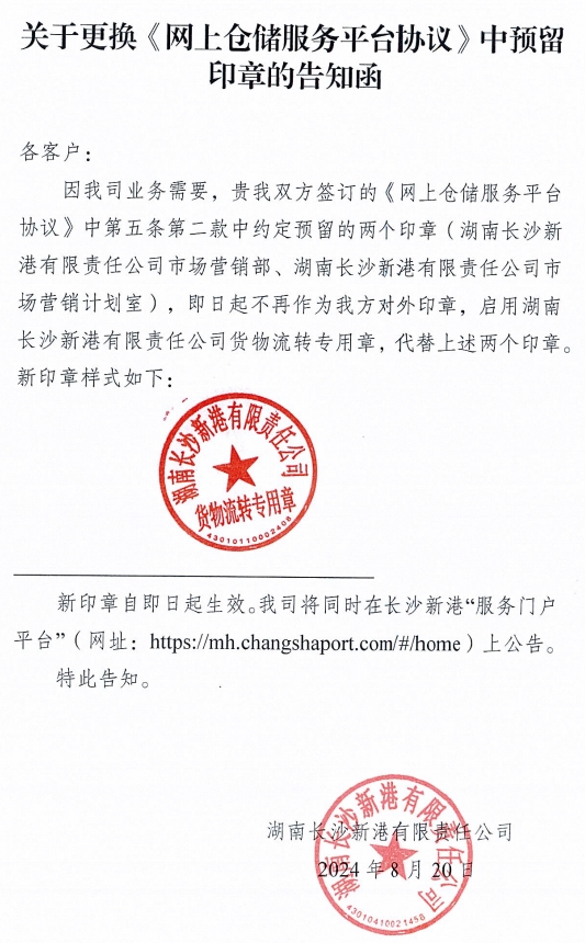 關(guān)于更換《倉儲合同》《網(wǎng)上倉儲服務(wù)平臺協(xié)議》中預留印章的告知函